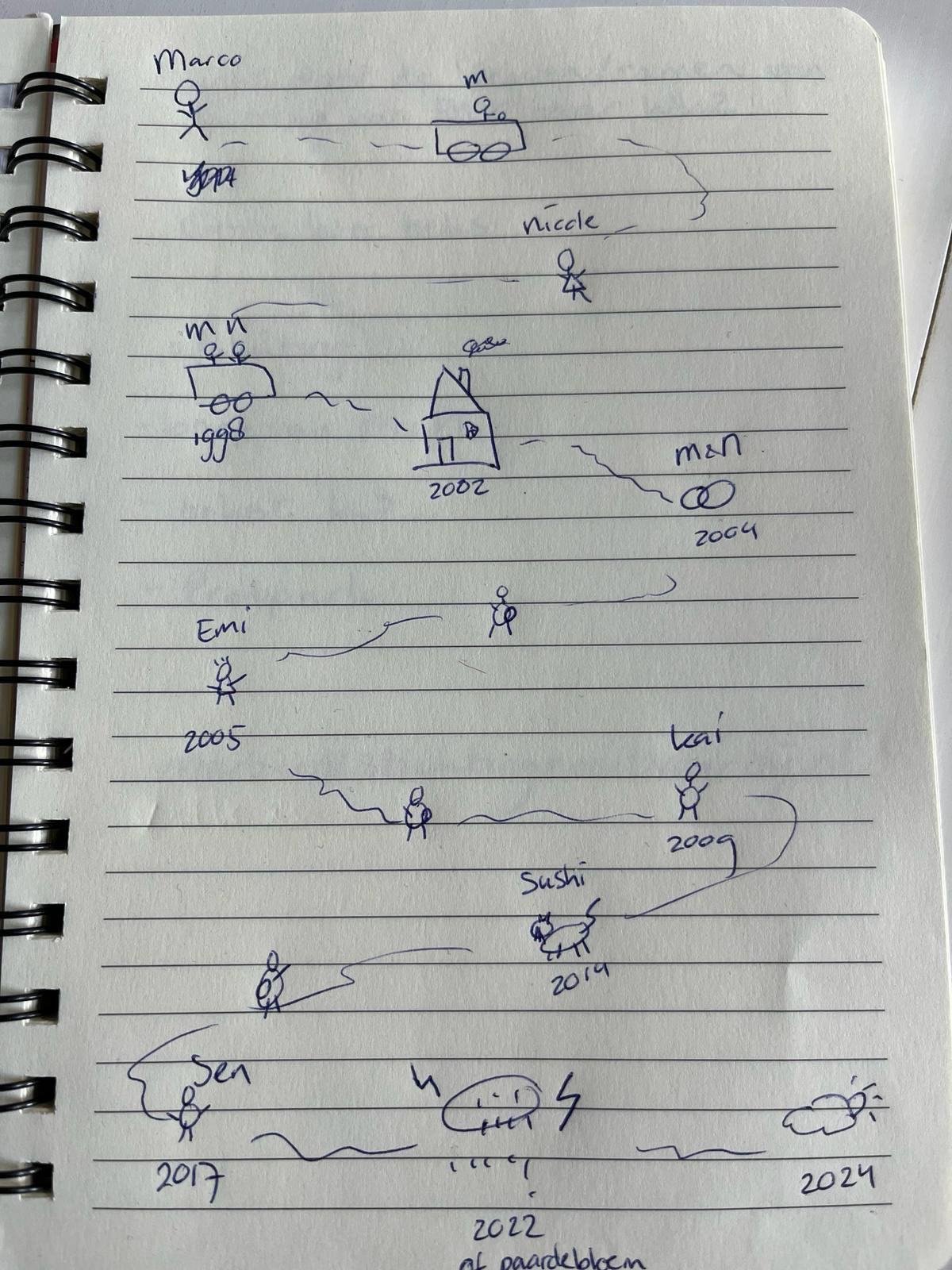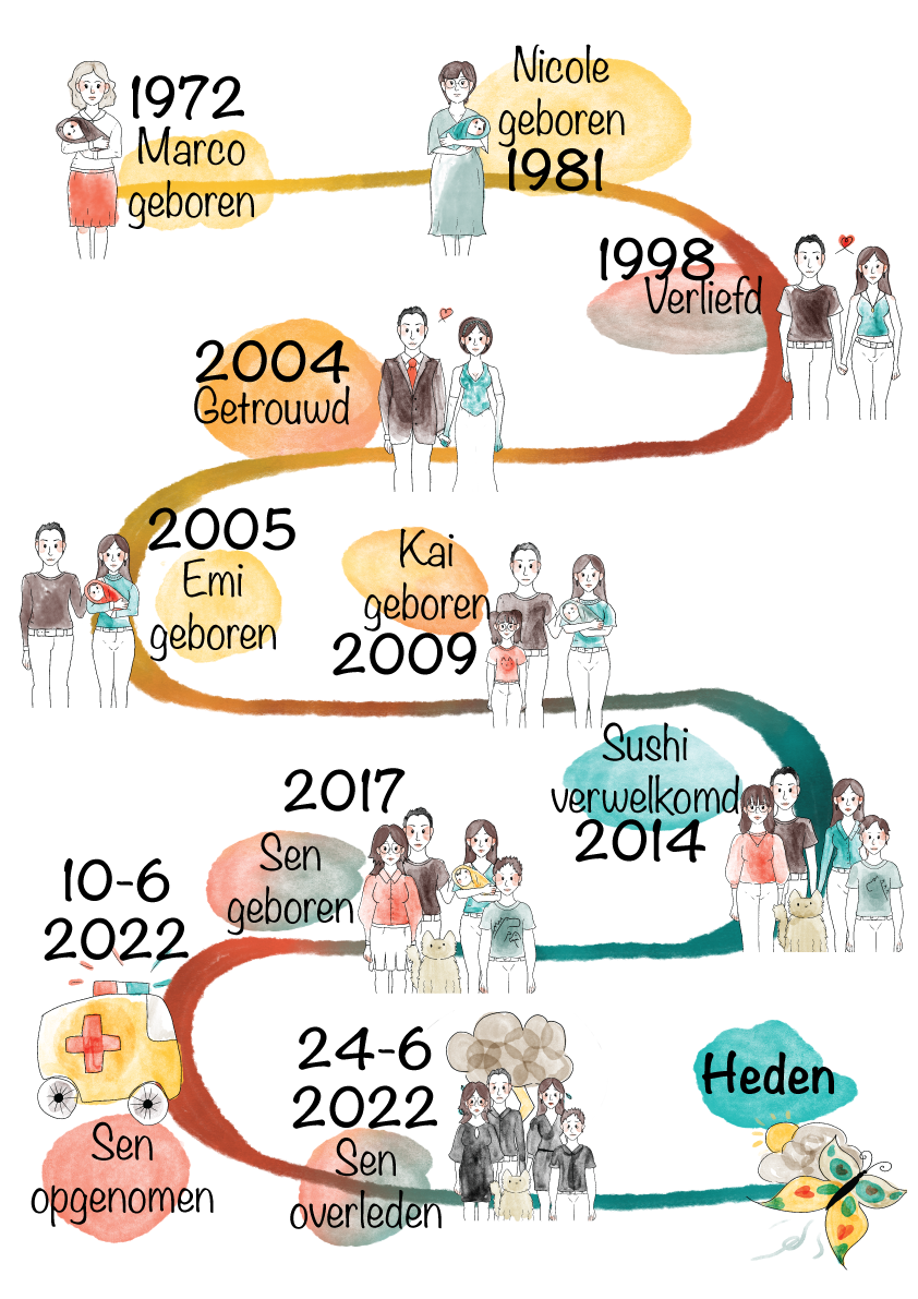 In 2002 they own a house on the Irenestraat. Married in 2004 and honeymooned in Indonesia. Got pregnant there. In 2005 Emi was born. In 2008 on vacation to Greece and got pregnant. In 2009, Kai was born. In 2014 came Sushi 🐈. In 2017 became pregnant with Sen (down syndrome). On 10-6- 2022 bad news and to the hospital (Princess Máxima Center) and on 24-6-2022 death. Today/now everything is slowly looking a little better again.