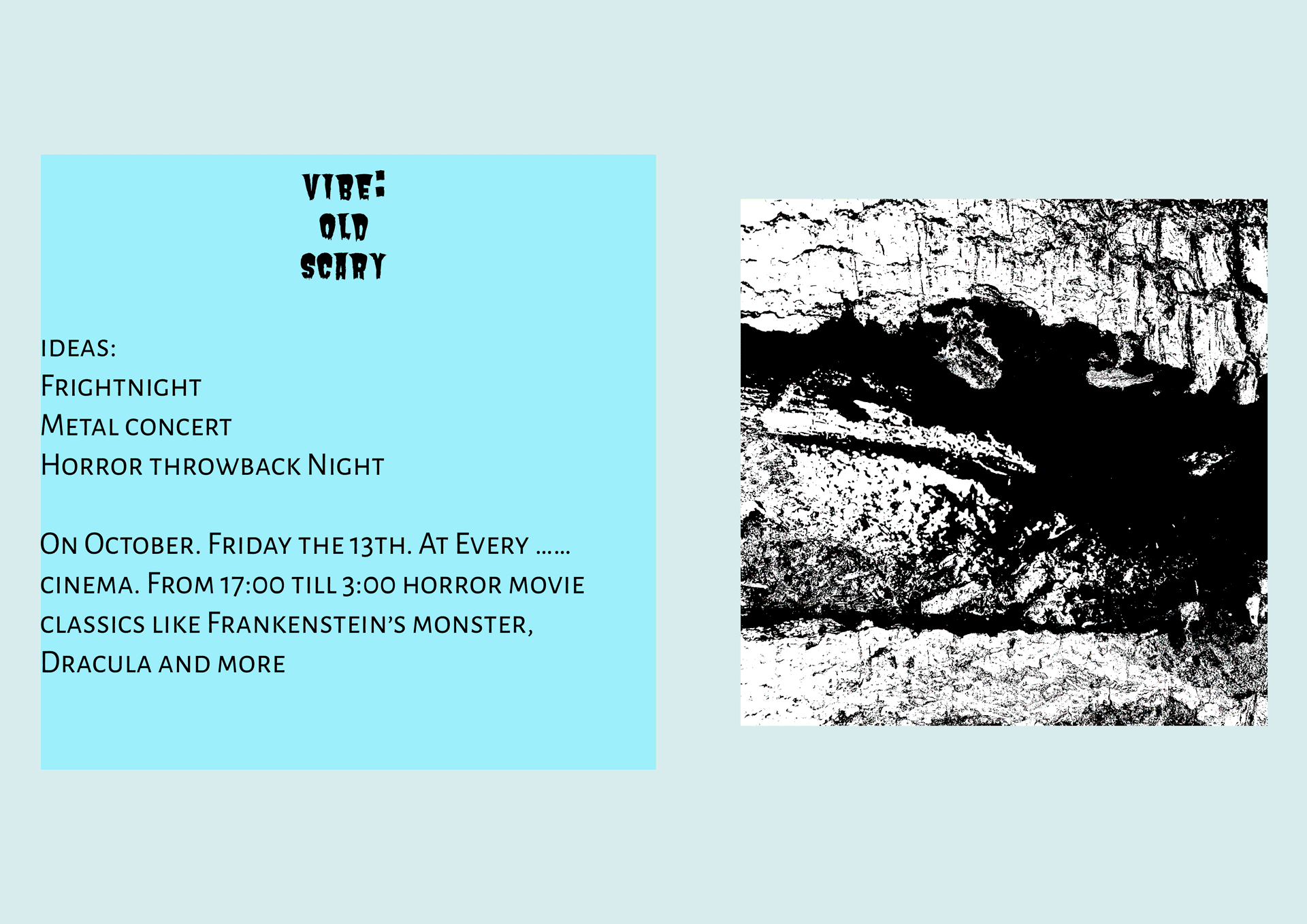 We chose five experiments that we were going to analyse to figure out what for vibe it had, what it would advertise, and we needed to find two fonts for each image.